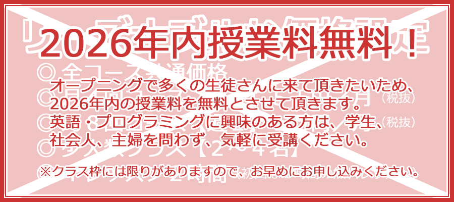 「なかよしのカルチャー倶楽部」では、オープニングで多くの生徒さんに来て頂きたいため、2026年内の授業料を無料とさせて頂きます。英語・プログラミングに興味のある方は、学生、社会人、主婦を問わず、気軽に受講ください。